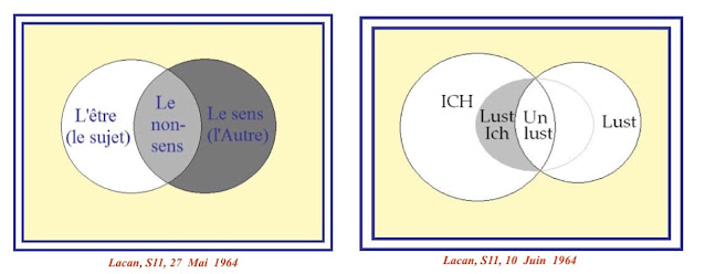 二つの図は基本的に同じ内容である。まず、左図の中心にある非意味について、《フロイトの表現を借りれば、主体の中には非意味の核がある[dans le sujet, un cœur, un Kern, pour s'exprimer comme FREUD, de non-sense]》 (Lacan, S11, 17 Juin 1964)とあるが、これが自我分裂の核にほかならない。