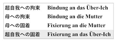 超自我文献③では、フロイトのエロス的固着[erotischen Fixierung の主要な内実は、トラウマ的固着[traumatischen Fixierung]ーー愛の喪失に対するトラウマ的不安への固着[Fixierung an die traumatischen Angst vor dem Liebesverlust]ーーであり、これが欲動の固着[Fixierung der Triebe]あるいはリビドーの固着[Fixierung der libido]の核心であるだろうことを示した。 |